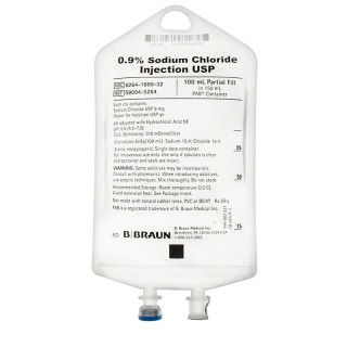 The B Braun S8004-5264 is a Sodium Chloride Injection USP, containing 0.9% sodium chloride. This solution is intended for use in both adults and pediatric patients as a source of electrolytes and water for hydration. Each mL of the injection contains 9 mg of Sodium Chloride USP and Water for Injection USP, with the pH adjusted using Hydrochloric Acid NF. The solution has a calculated Osmolarity of 310 mOsmol/liter. The product comes in a 100 mL fill in a 150 mL PAB container, ensuring accurate dosage and ease of use. This injection is also designed to serve as a diluent and delivery system for intermittent intravenous administration of compatible drug additives. The container is made from a biologically inert copolymer of ethylene and propylene, free from PVC and DEHP. It features two ports, one for the intravenous administration set and the other for medication addition, each covered by a tamperproof barrier for safety. Each case contains 64 units, ensuring a sufficient supply for medical facilities.