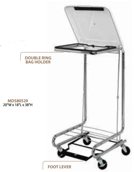 Single bag hamper offers foot activated ABS heavyduty lid for quick accessibility. Double ring bag holder allows for quick bag insertion and bag lock. Supports 36-42 gallon multi-purpose bags with a ring to keep bag in place. Four 3″ casters (2 with brake) allows for easy mobility.