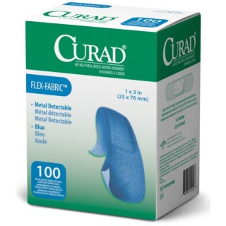 CURAD blue bandages meet the needs of the food service industry with their high visibility and innovative, long-lasting adhesive thats gentle on the skin. Detectable metal hidden behind the non-adherent wound pad easily triggers metal detectors used by food packagers. This routine process scans for dangerous metal debris such as screws or knife tips, that can accidentally fall into food during processing. In addition, the highly identifi able blue color stands out in all different foods.