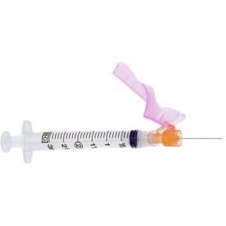 BD Eclipse Syringe / Needle Combination single-handed, detachable needle injection device is beveled oriented to the safety cover to facilitate low-angle injections. Luer-Lok hub. Bold graduations on syringe barrel.