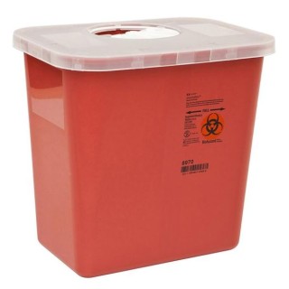 The Cardinal Health 8970 is a 2-gallon sharps container designed for the safe disposal of used medical instruments or devices with sharp edges or points, such as needles, syringes, lancets, and scalpels. This red, polypropylene container features a unique rotor opening lid that allows for easy, safe, and convenient disposal of sharps without direct contact with the container’s opening, reducing the risk of accidental needlesticks or exposure to the disposed sharps.