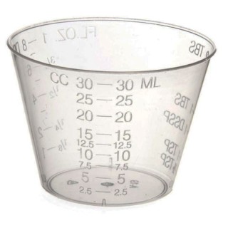 - Translucent plastic cups suitable for dispensing both liquid and dry medications.