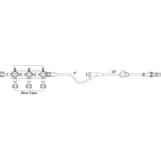 3-Gang Large Bore 4-Way Hi-Flo Manifold with Non-Vented Blue Caps on Middle Ports Detachable Standard Bore Extension SmartSite Needle-Free Valve Pinch Clamp – SM7223SC
